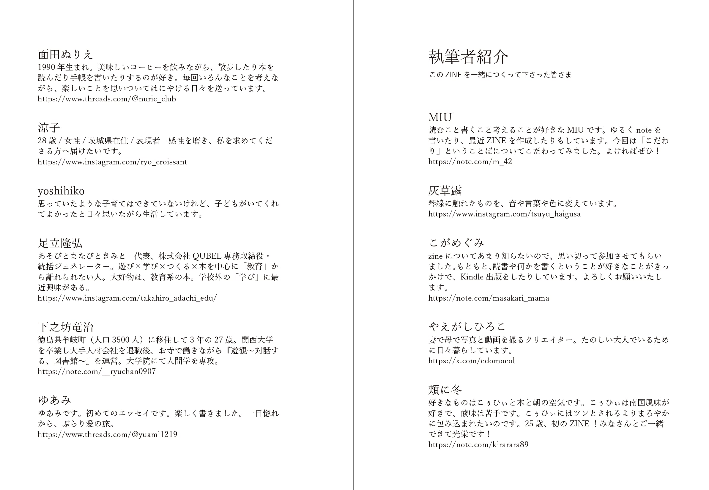 巻末にそれぞれの自己紹介も掲載していますので、気になる書き手の方がいれば、ぜひ直接コンタクトしてみてください。
